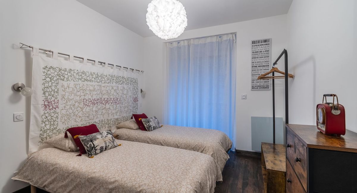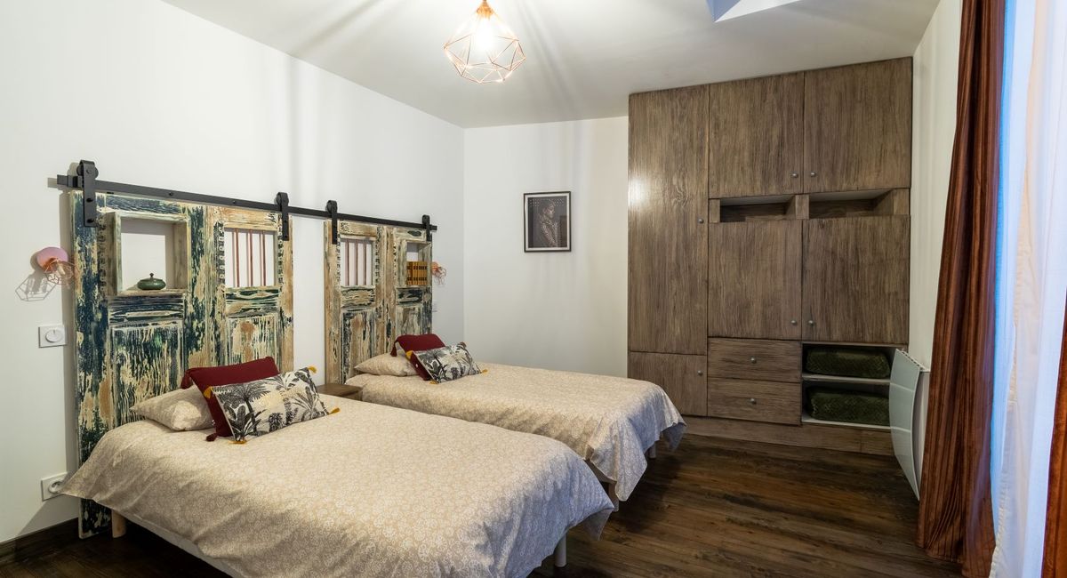 Rénové en 2022, il propose 2 chambres avec 2 lits simples (ou, en les rapprochant, d'un ou 2 lits king size), de 2 salles de douche avec sèche serviettes et de 2 WC indépendants.