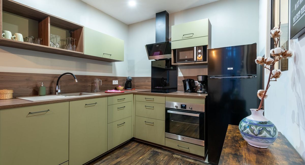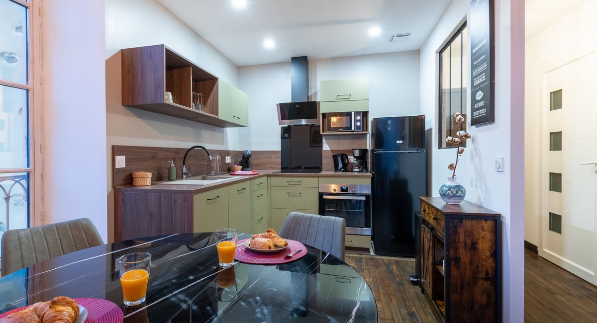 Ouverte sur le salon avec son balcon français, la cuisine est tout équipée (dont une cafetière 'Dolce Gusto').