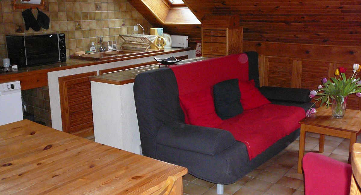 La pièce de vie de 26 m² se partage entre un coin salon (banquette convertible), une salle à manger et un coin cuisine équipée. Tout pour se délasser après une belle journée de ski.