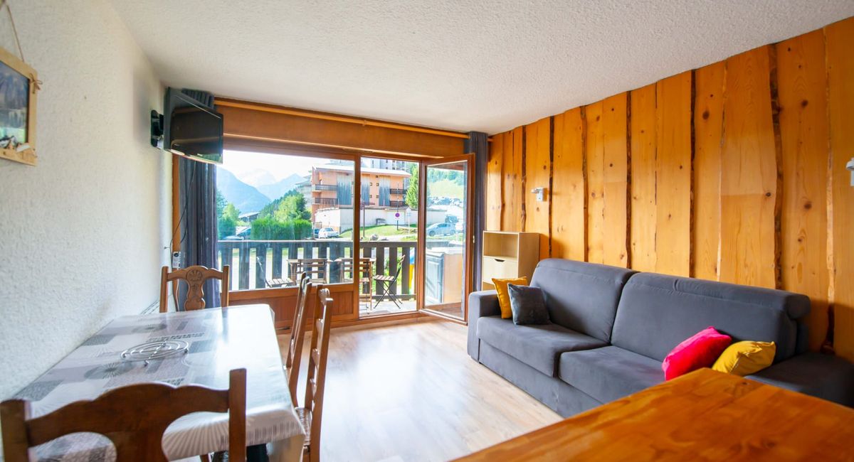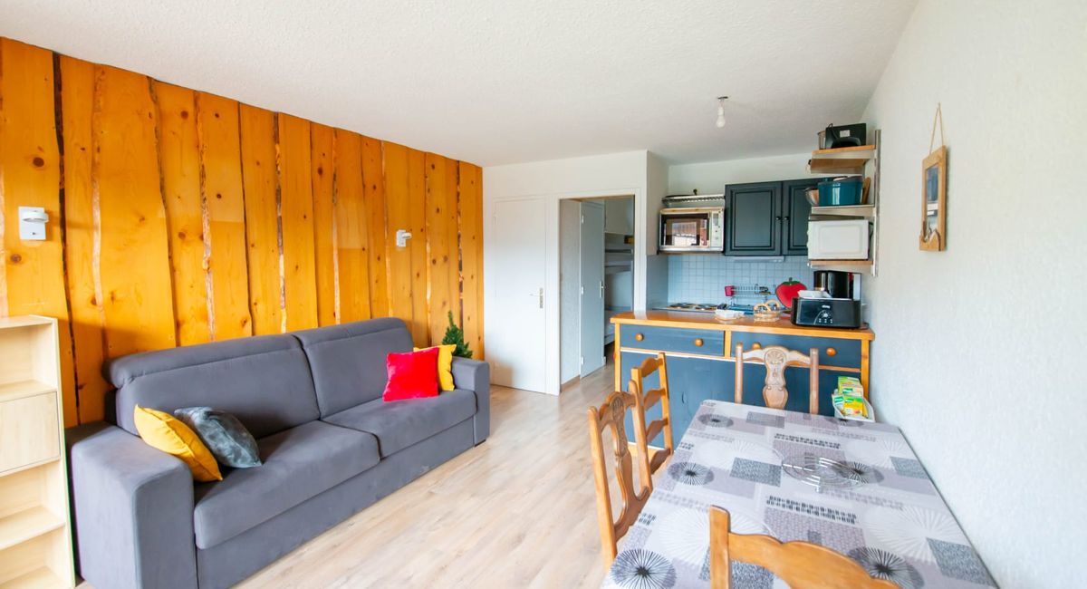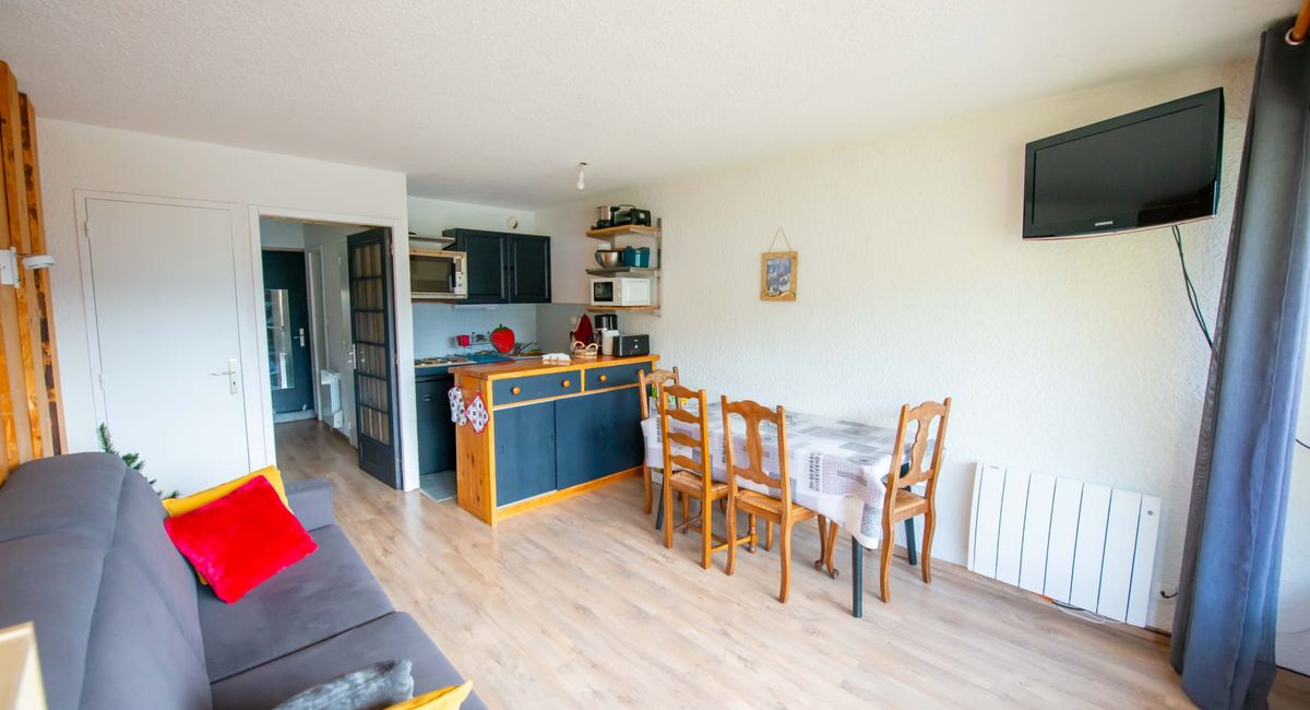 D’une superficie de 18 m², la pièce de vie comprend 1 kitchenette toute équipée, un coin repas et 1 canapé lit tout neuf (en 140) à côté de la grande baie vitrée exposée sud-est.